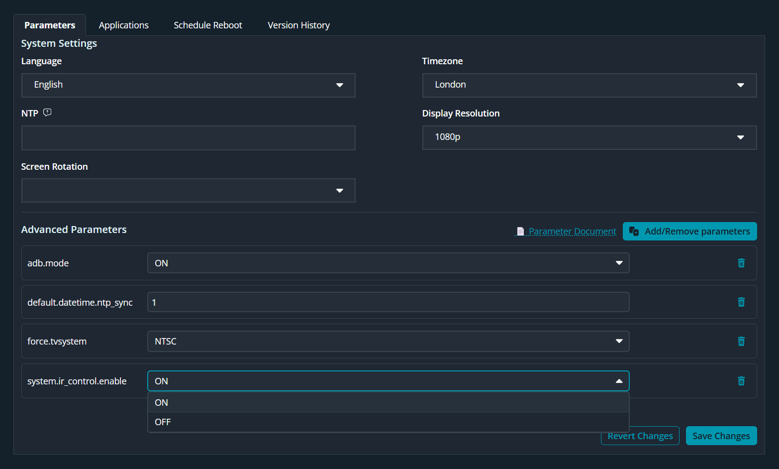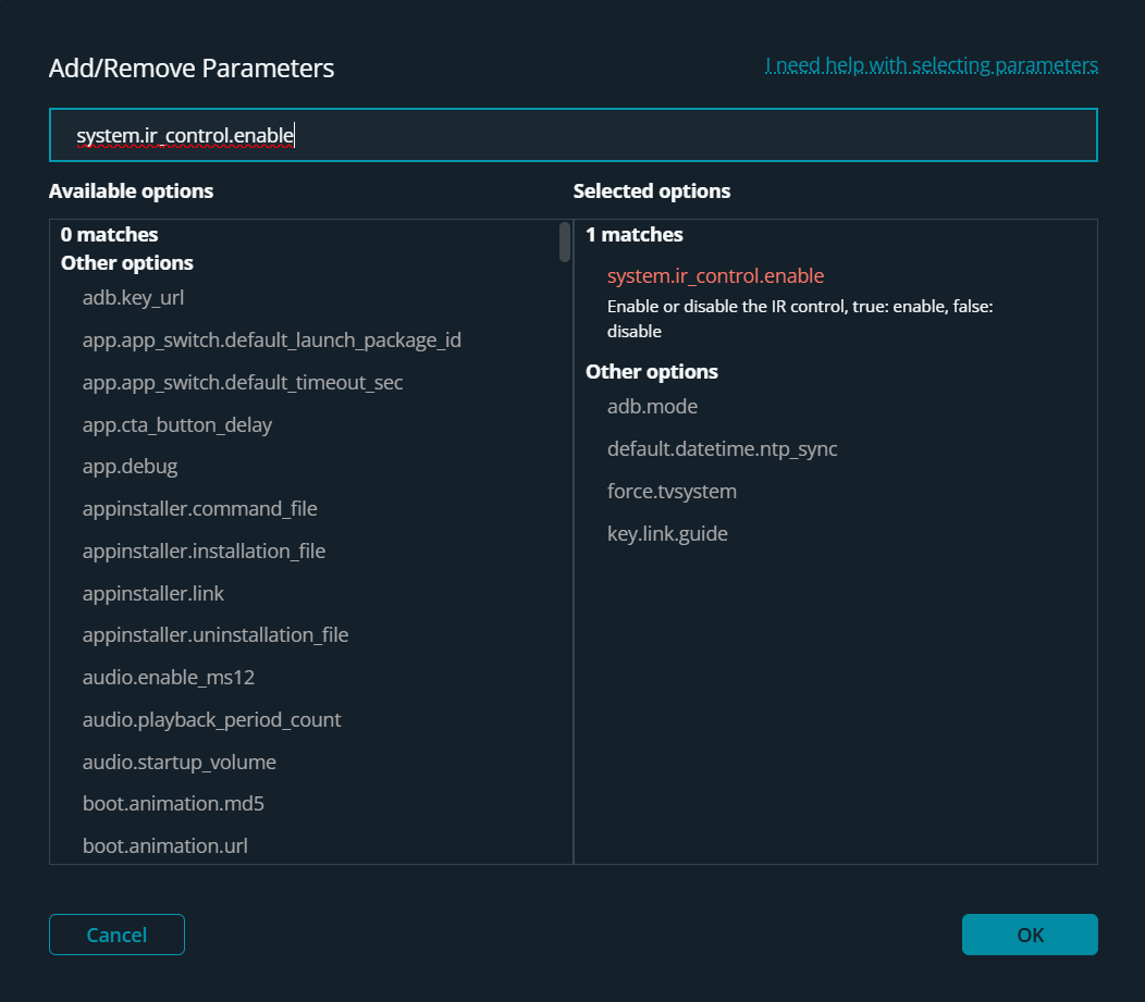 The system parameter system.ir_control.enable manages the IR receiver state. This parameter may be read during boot and sets the IR receiver status.
